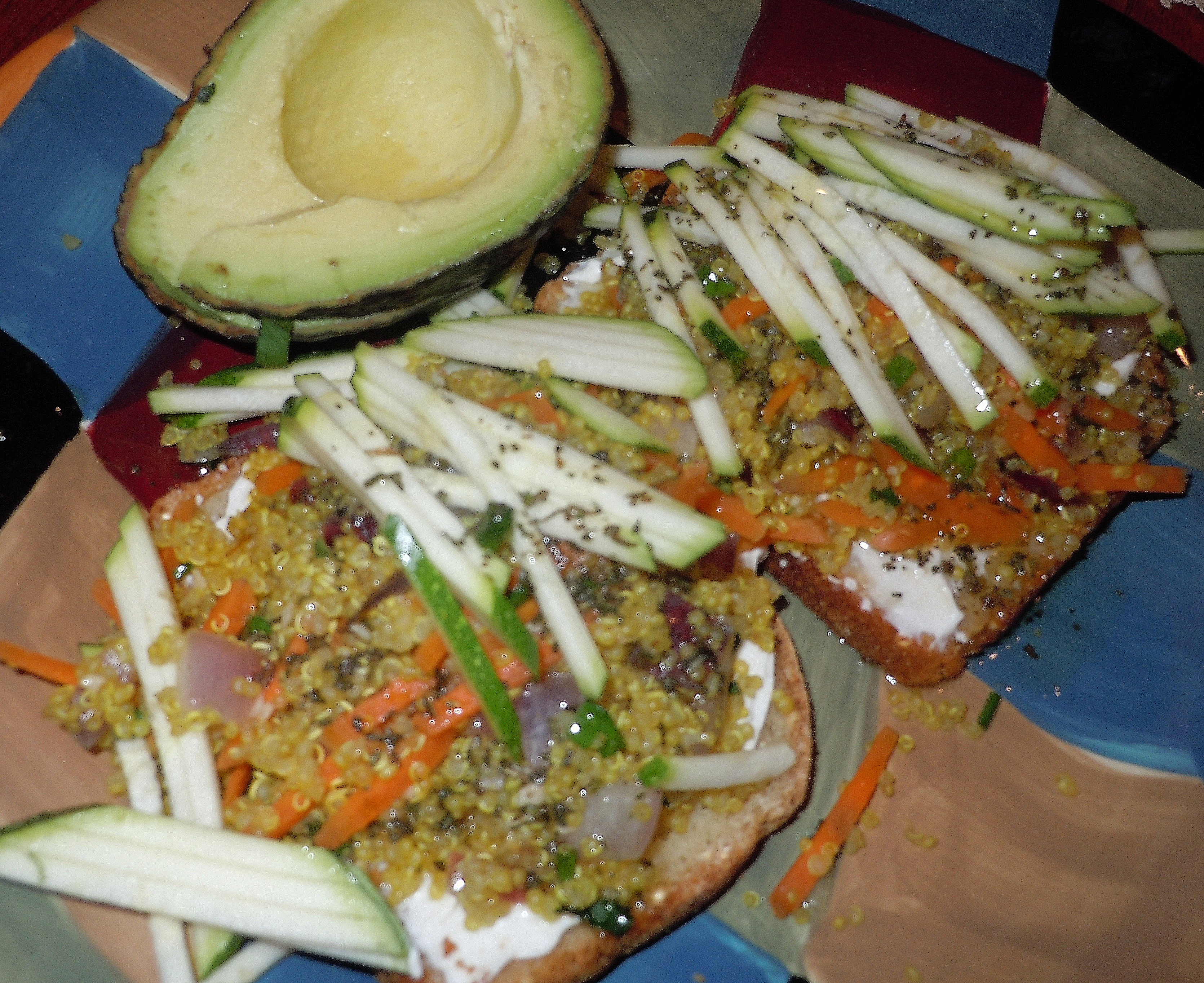 5. Spread the toasted millet bread with the vegan cream cheese, top with the quinoa mixture, and garnish with shredded zucchini. Drizzle the olive oil dressing over the top, serve with half of a freshly-cut avocado!