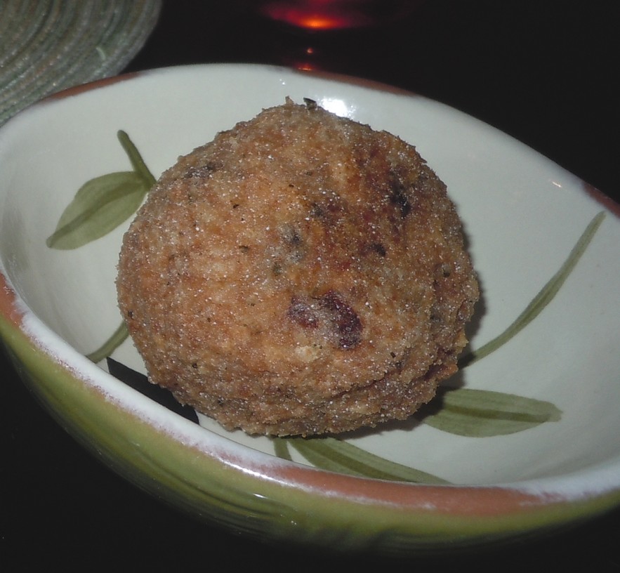6. Place rice ball into pre-heated peanut oil (350 degrees).  (Using an electric fondue pot is an excellent way of handling this part of the recipe!)  Deep-fry for about 2 minutes, or just when the flour starts to look golden brown.  Remember that the ball will continue to cook for several minutes after it is removed from the heat.