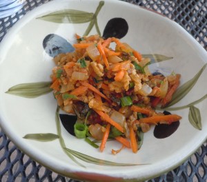 2. When carrots are almost soft, drain them out of the water with a slotted spoon and put into the onion/tomato mixture, and add the diced mushrooms. Add the ToFurky ground beef, and toss until everything evenly mixed. Allow to cook for about 3 minutes, tossing after each minute. Turn off heat. Add some of the carrot water if it seems too dry. Season with fresh herbs.