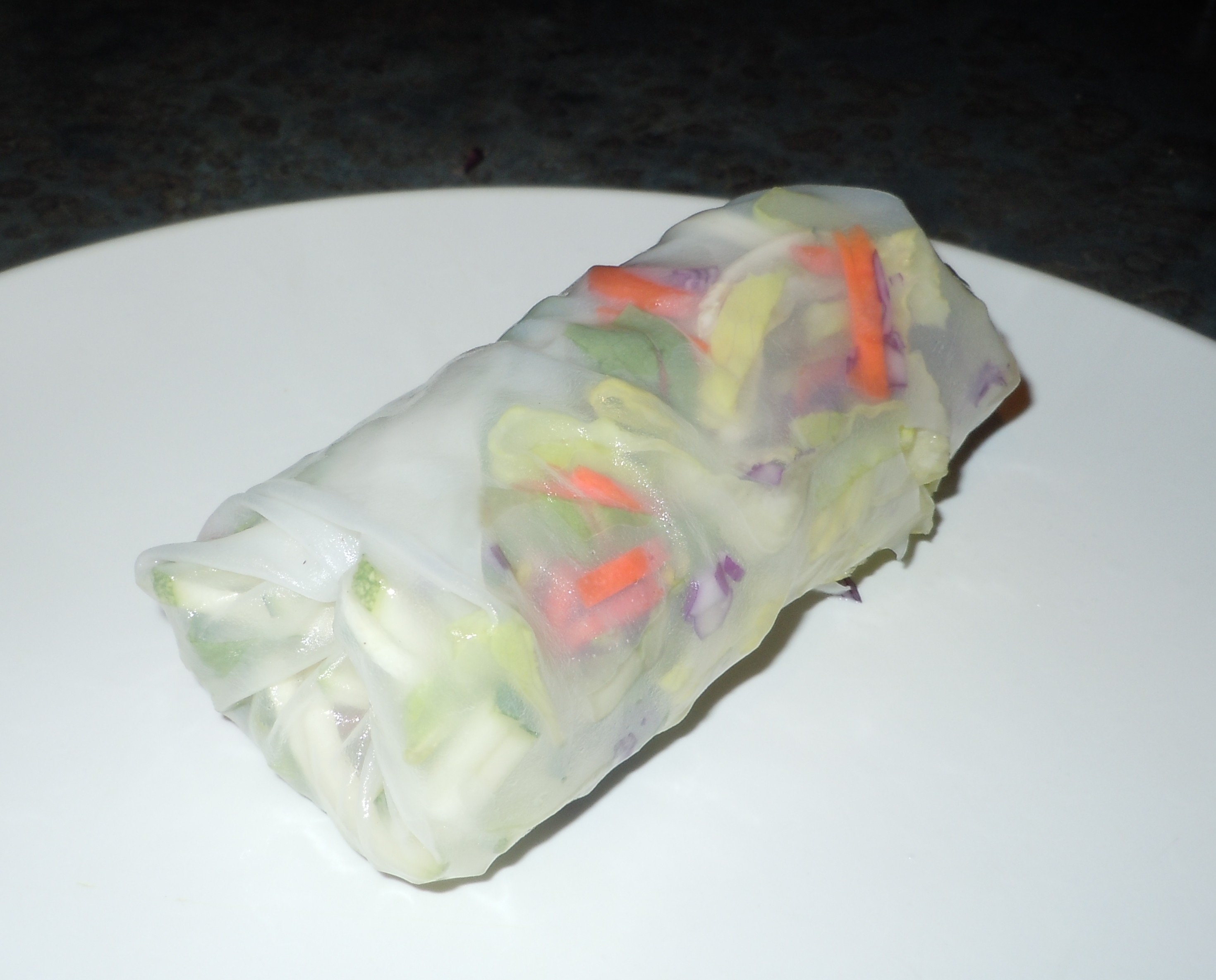 3. Layer raw vegetables in a row that stretches across the middle of the rice paper, leaving about 2-3 inches on either side.